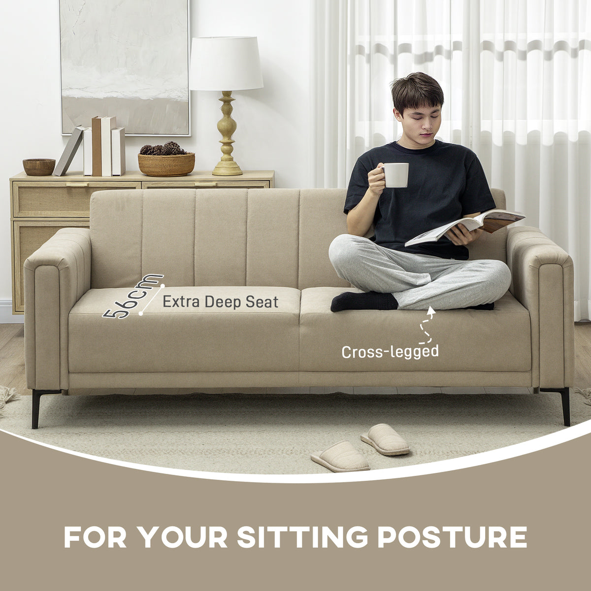 HOMCOM Three Seater Sofa Full Size Channel Tufted For Home - Khaki