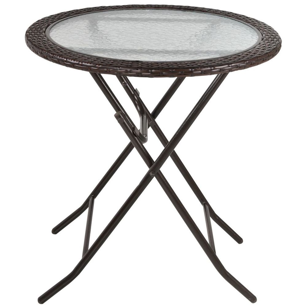 Outsunny Folding Round Tempered Glass Metal Table with Brown Rattan Edging